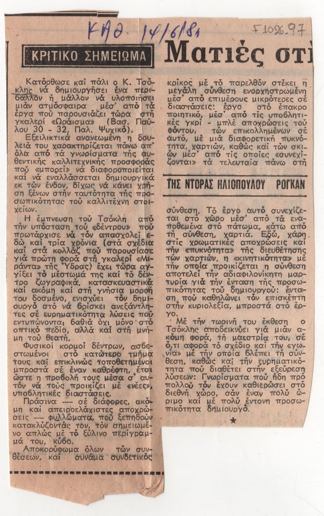 Απόκομμα, έντυπο, χαρτί, 16,5×10,4 εκ., όπου δημοσιεύεται, στα ελληνικά, κριτική της έκθεσης του Κώστα Τσόκλη στην Αθήνα, το 1981. Η κριτική εντάσσεται στη στήλη “Ματιές στις εκθέσεις”.