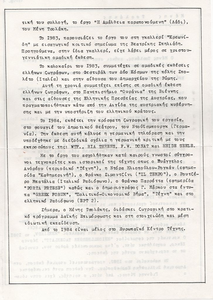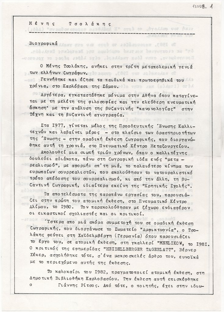 Κείμενο, δακτυλόγραφο, στα ελληνικά, χαρτί, δύο όψεις, 29,8×21,0 εκ. Βιογραφικό σημείωμα του Αριστομένη Τσολάκη. Αναφέρονται σπουδές, καλλιτεχνική πορεία, εκθέσεις και άλλες δραστηριότητες.