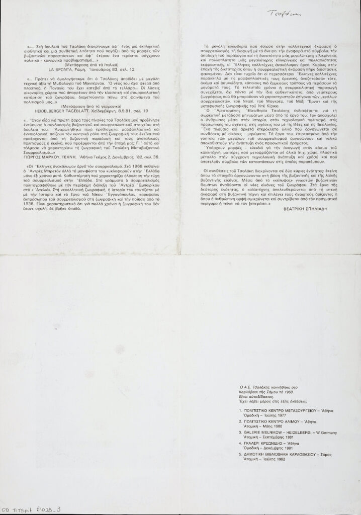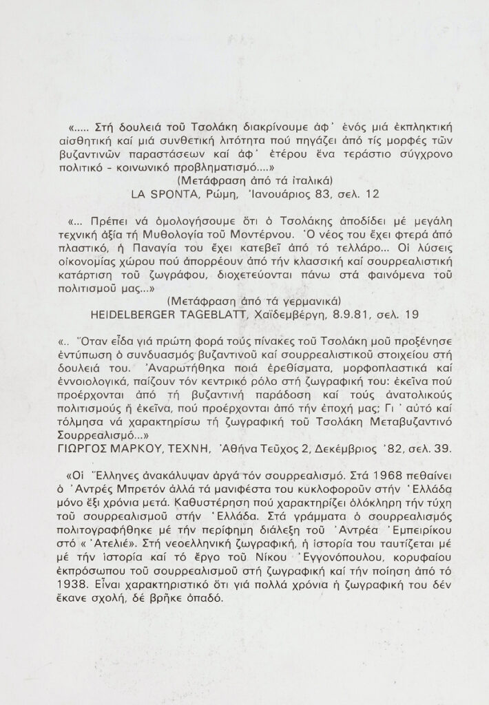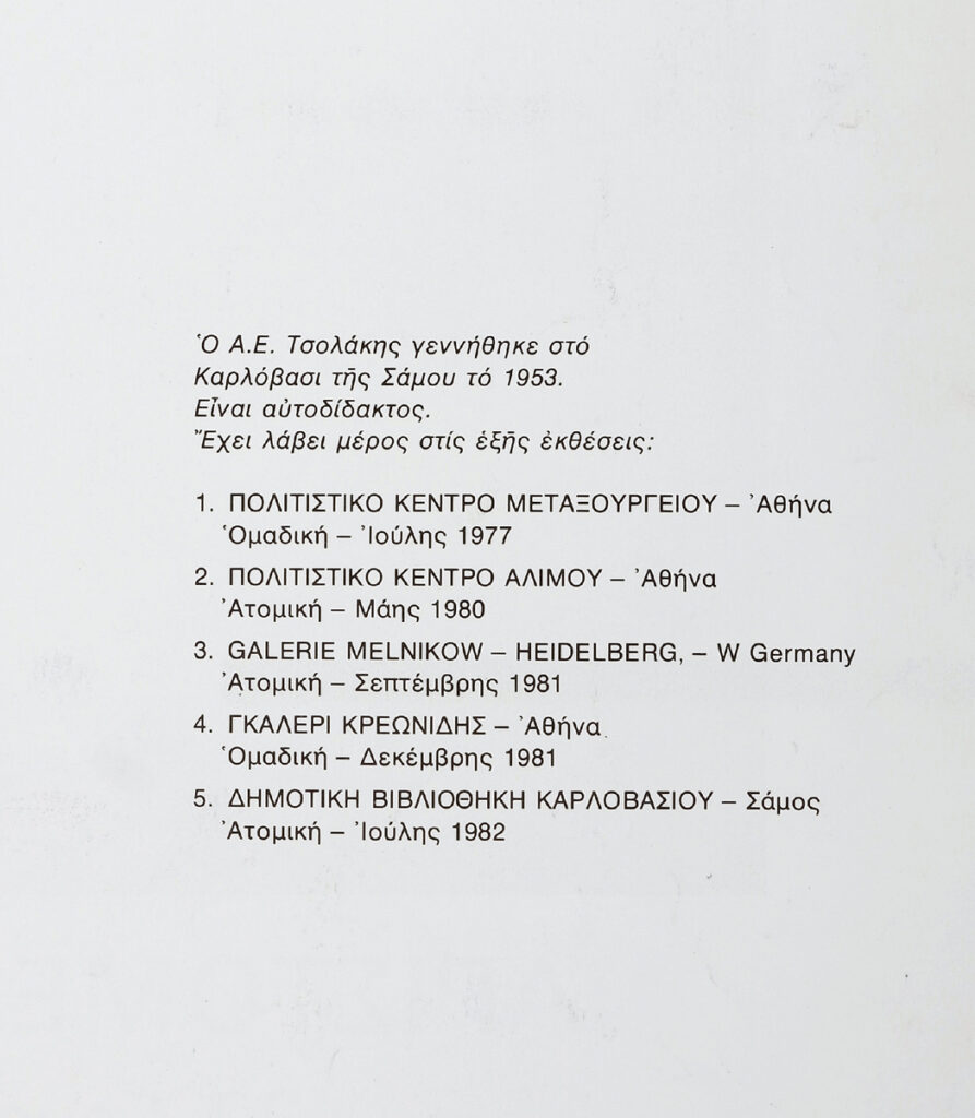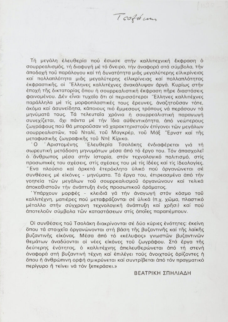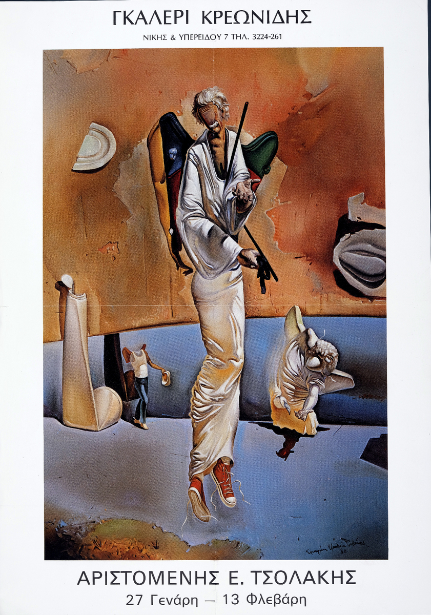 Αφίσα-έντυπο της ατομικής έκθεσης ζωγραφικής του Μένη Τσολάκη στην “Γκαλερί Κρεωνίδης” στην Αθήνα το 1983. Περιέχει βιογραφικό σημείωμα και κριτικό σημείωμα της Βεατρίκης Σπηλιάδη και αποσπάσματα κριτικών.