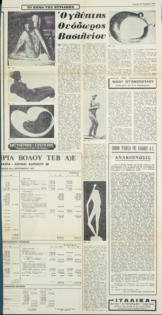 Απόκομμα της εφημερίδας “Το Βήμα” (28/11/1971). Κείμενο του Ν. Εγγονόπουλου για το έργο του Θ. Βασιλείου.
