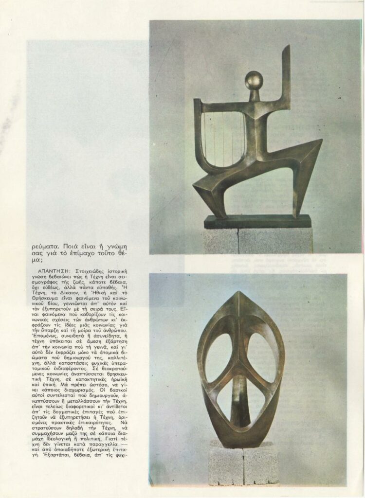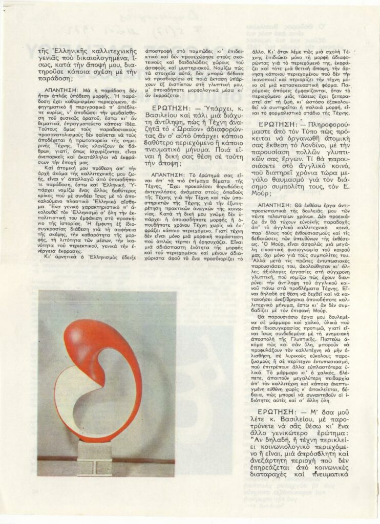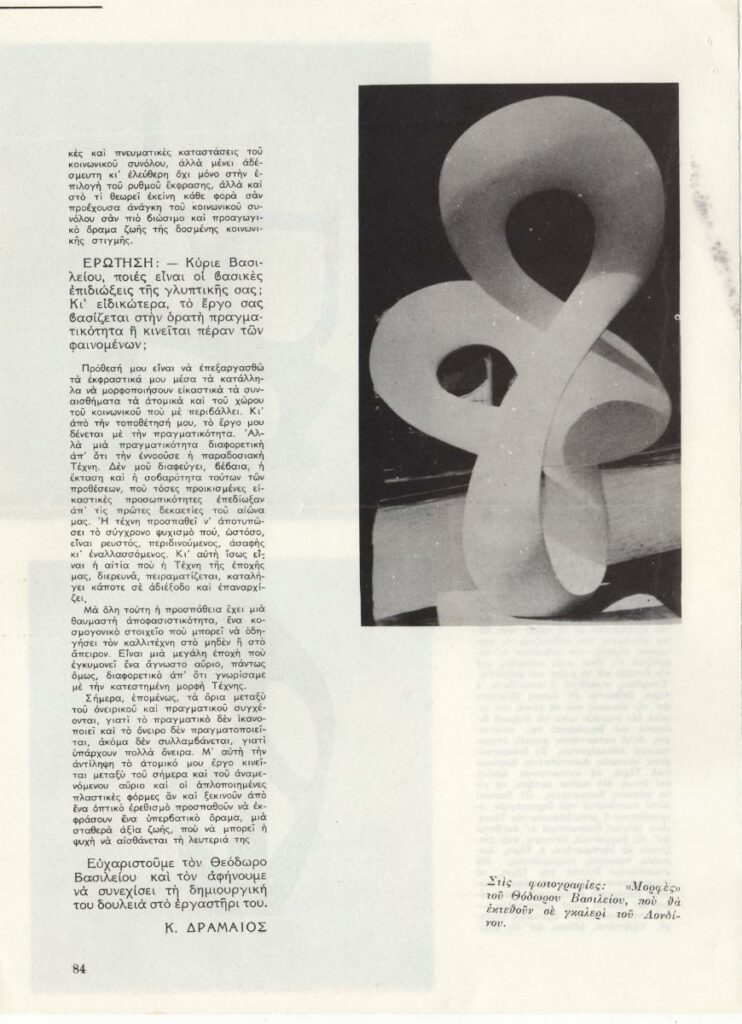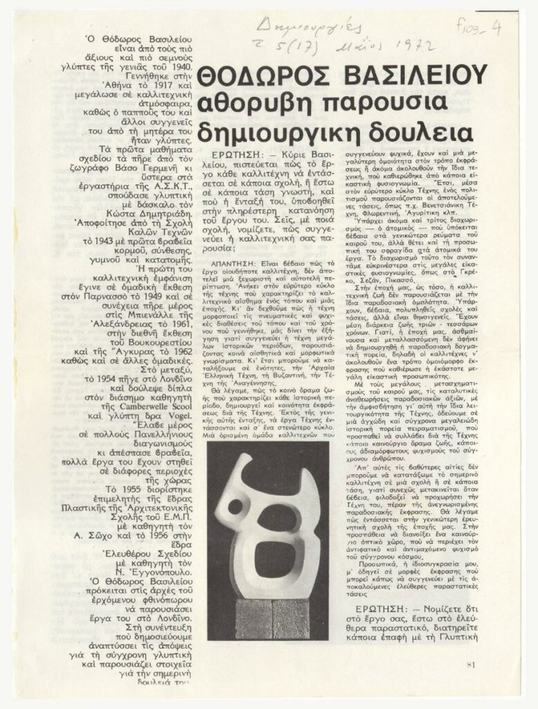 Απόκομμα, έντυπο, χαρτί ιλουστρασιόν, 2 φφ, 28,2×20,8 εκ., όπου δημοσιεύεται, στα ελληνικά, συνέντευξη του γλύπτη Θεόδωρου Βασιλείου με αφορμή επικείμενη έκθεση έργων του στο Λονδίνο. Στην πρώτη σελίδα επιγραφή.