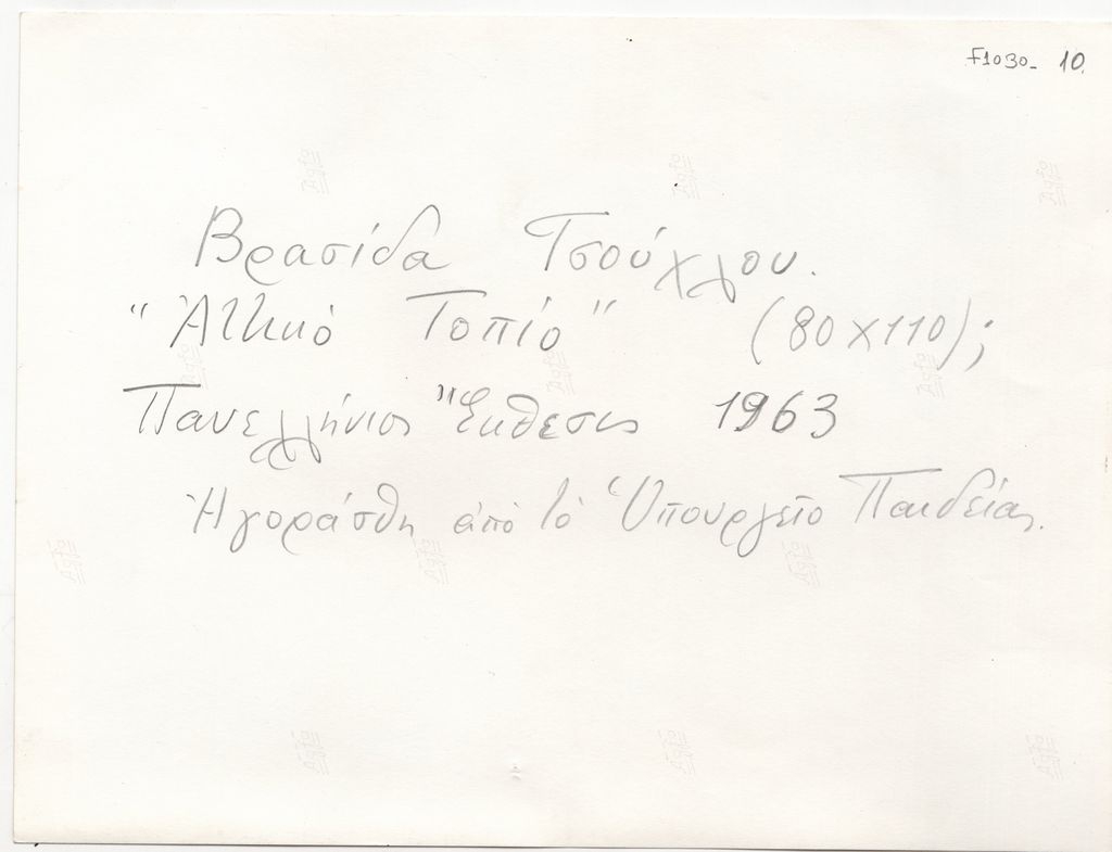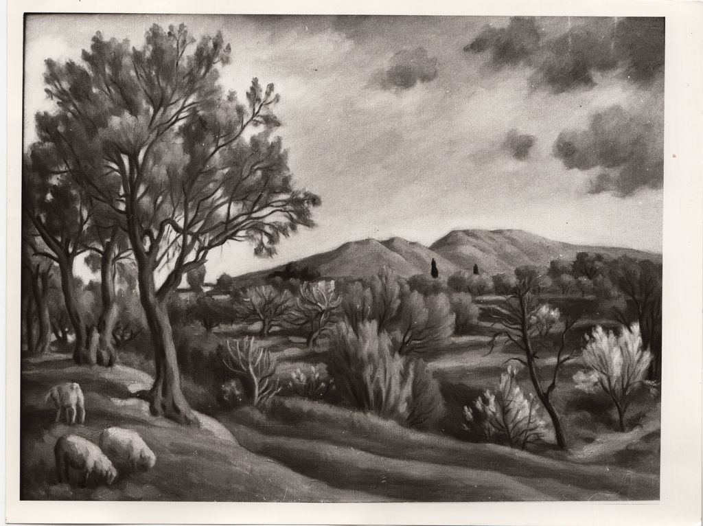 Φωτογραφία, α/μ, φωτογραφικό χαρτί, 18,0×24,0 εκ. Αναπαραγωγή του έργου του Βρασίδα Τσούχλου με τίτλο «Αττικό τοπίο». Στην πίσω όψη, επιγραφή.