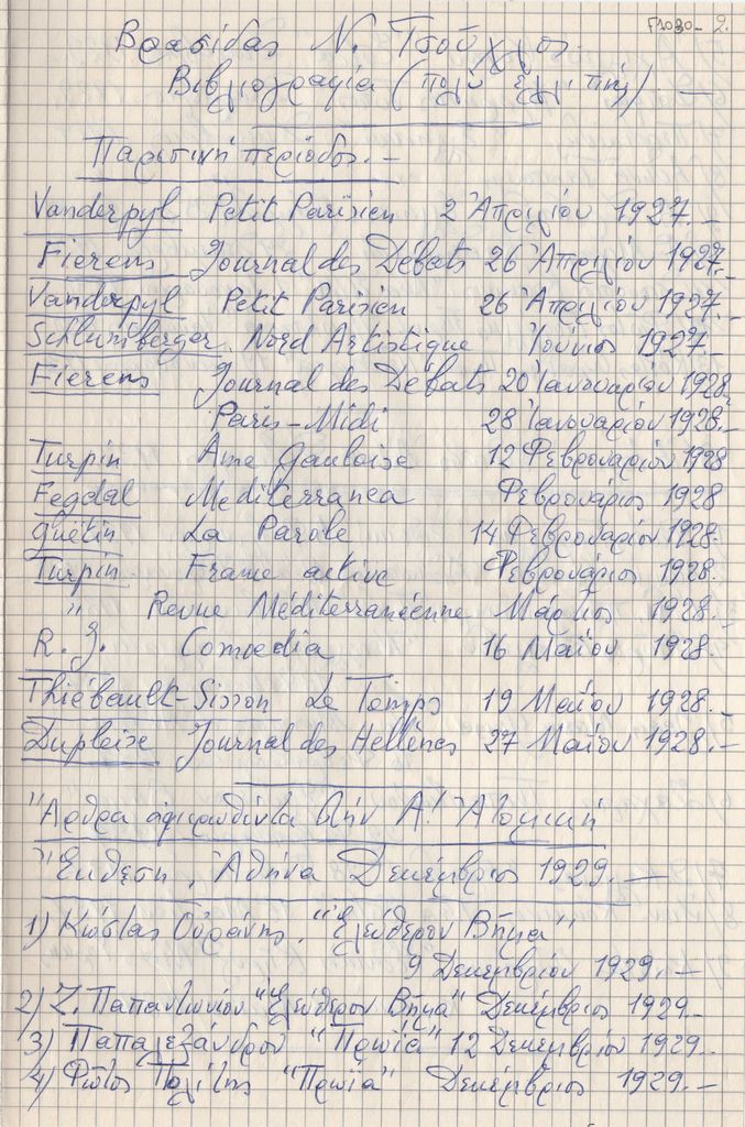 Κείμενο, χειρόγραφο, με μπλε μελάνι, στα ελληνικά, σε δίπτυχο χαρτιού, 30,0×19,7 εκ. Ιδιόχειρος (;) κατάλογος βιβλιογραφικών τίτλων για τον Βρασίδα Τσούχλο.