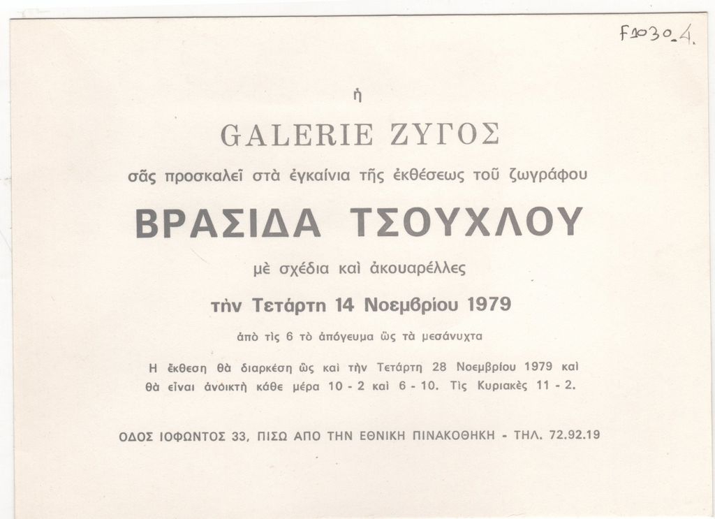 Έντυπο, στα ελληνικά, μονόφυλλο, χαρτόνι, μία όψη, 12,3×17,0 εκ. Πρόσκληση των εγκαινίων της ατομικής έκθεσης ζωγραφικής με σχέδια και ακουαρέλλες του Βρασίδα Τσούχλου στην Αθήνα το 1979.