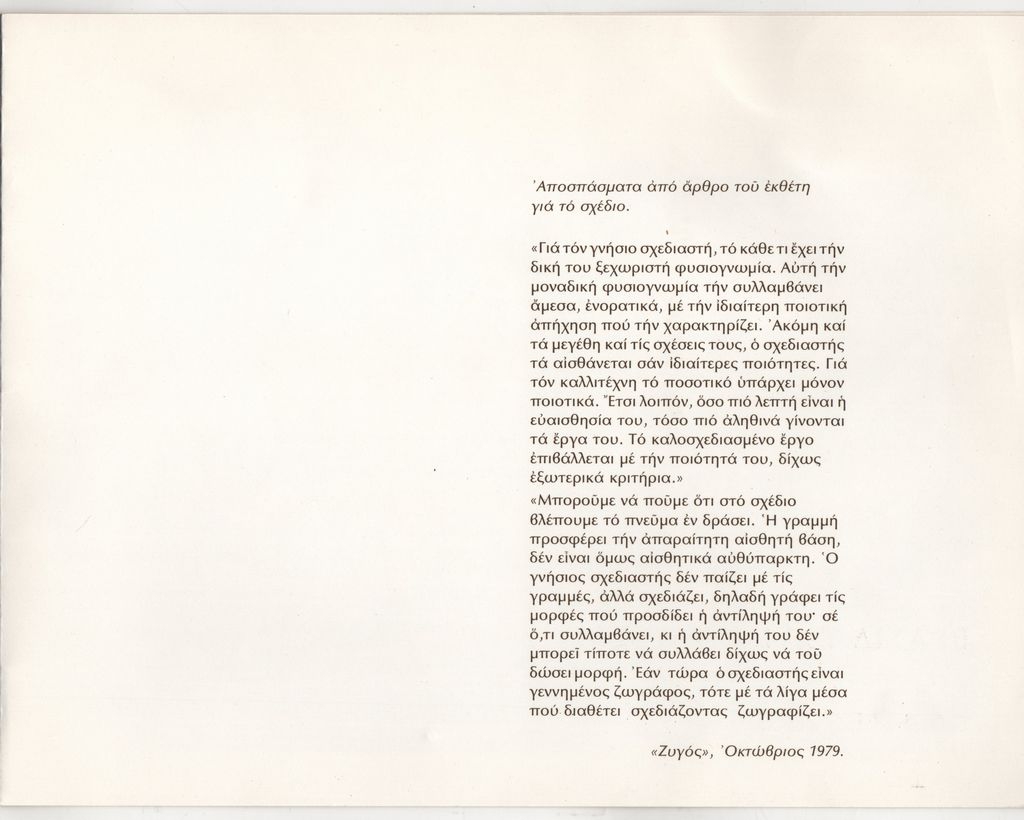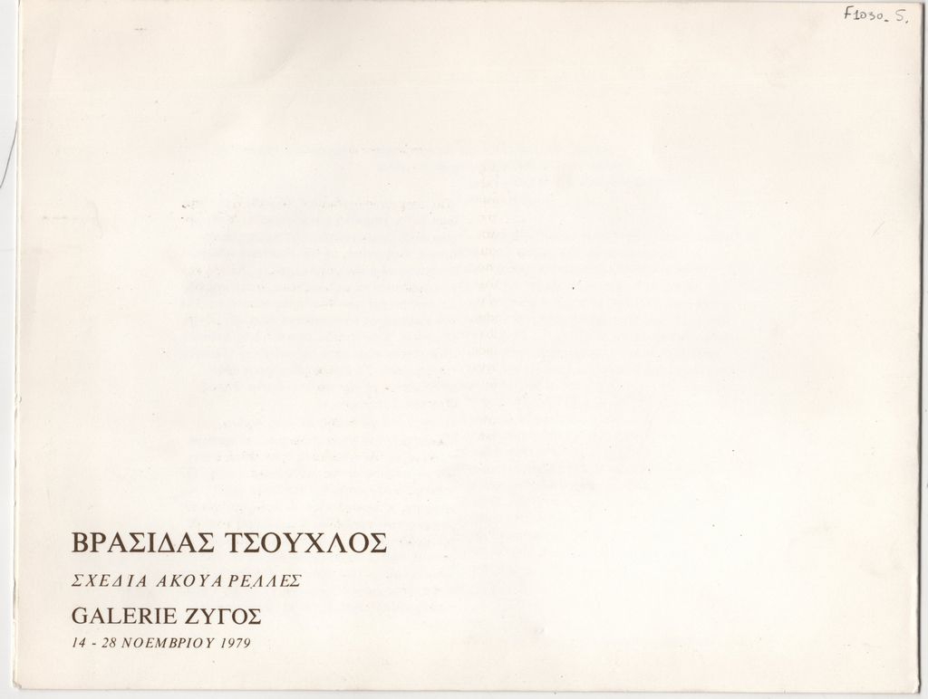 Έντυπο, στα ελληνικά, δίπτυχο, χαρτόνι, 20,3×26,5 εκ. Φυλλάδιο της ατομικής έκθεσης ζωγραφικής με σχέδια και ακουαρέλλες του Βρασίδα Τσούχλου στην Αθήνα το 1979. Περιέχει απόσπασμα κριτικού σημειώματος του Ζαχαρία Παπαντωνίου για τον καλλιτέχνη, που δημοσιεύτηκε, στα ελληνικά, στην εφημερίδα “Ελεύθερον Βήμα” και απόσπασμα άρθρου του καλλιτέχνη για το σχέδιο, που δημοσιεύτηκε, στα ελληνικά, το περιοδικό “Ζυγός”.