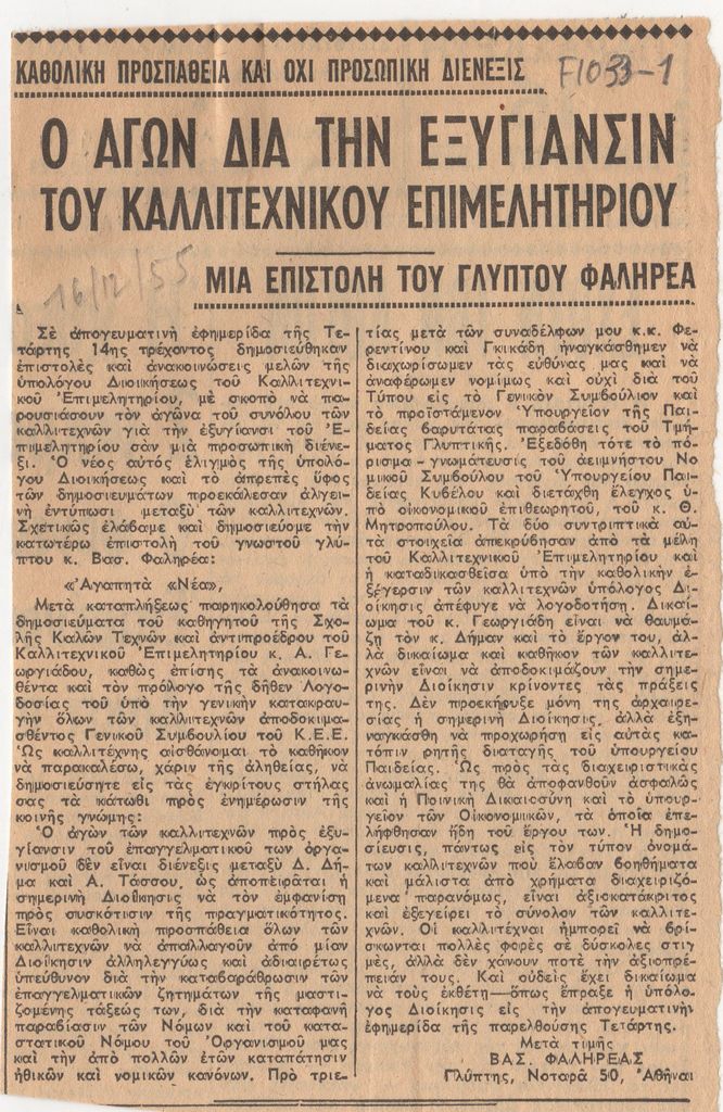 Απόκομμα, χαρτί, 15.5×10 εκ., στα ελληνικά, δημοσίευσης επιστολής απεσταλμένης από τον Βάσο Φαληρέα, αναφορικά με το Καλλιτεχνικό Επιμελητήριο.