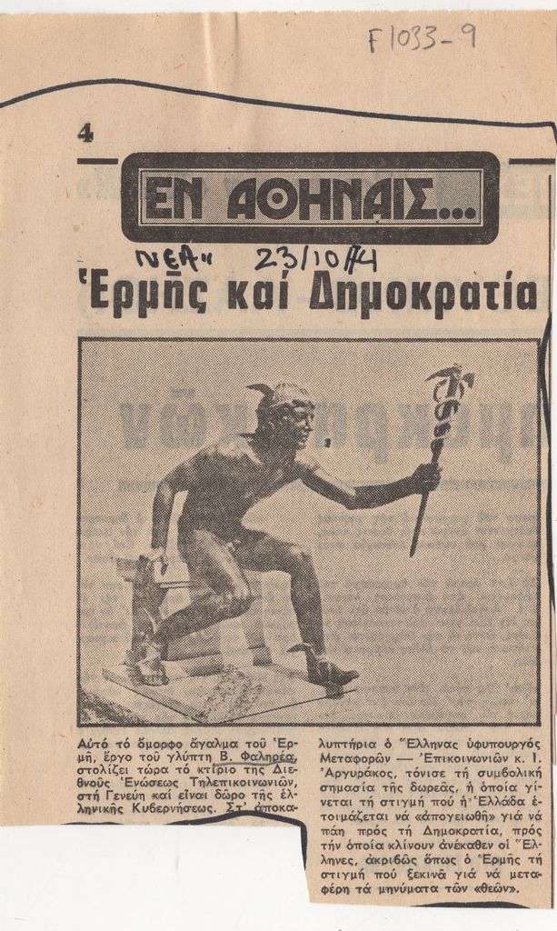 Απόκομμα, χαρτί ακανόνιστου μεγέθους, στα ελληνικά, δημοσίευσης άρθρου αναφερόμενου σε γλυπτό του Βάσου Φαληρέα, με εικονιζόμενο τον Ερμή, που βρίσκεται στο κτίριο Διεθνούς Ενώσεως Τηλεπικοινιών στη Γενεύη, προερχόμενο από δωρεά της ελληνικής κυβέρνησης.