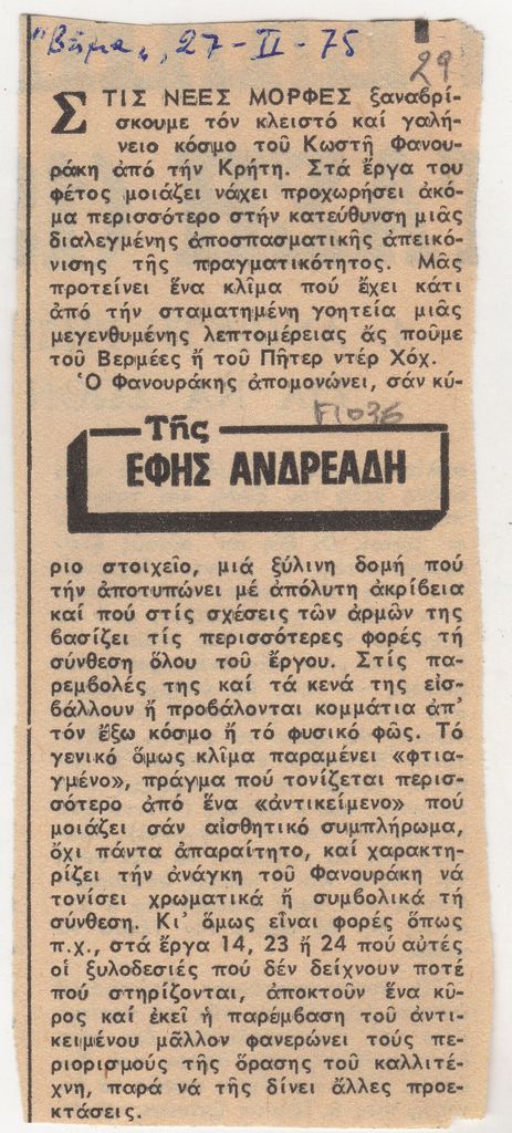 Απόκομμα, χαρτί, 12.5×5.5 εκ., στα ελληνικά, δημοσίευσης κριτικής έκθεσης του Θωμά Φανουράκη, η οποία διεξάγεται στην γκαλερί Νέες Μορφές στην Αθήνα.