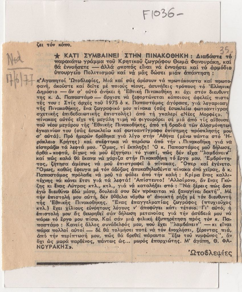Απόκομμα, χαρτί συρραμμένο σε έντυπο, 11×14 εκ., στα ελληνικά, δημοσίευσης επιστολής του Θωμά Φανουράκη, στην οποία μιλά για την καθυστέρηση πληρωμής του απο την Εθνική Πινακοθήκη για έργο του που προσέφερε.