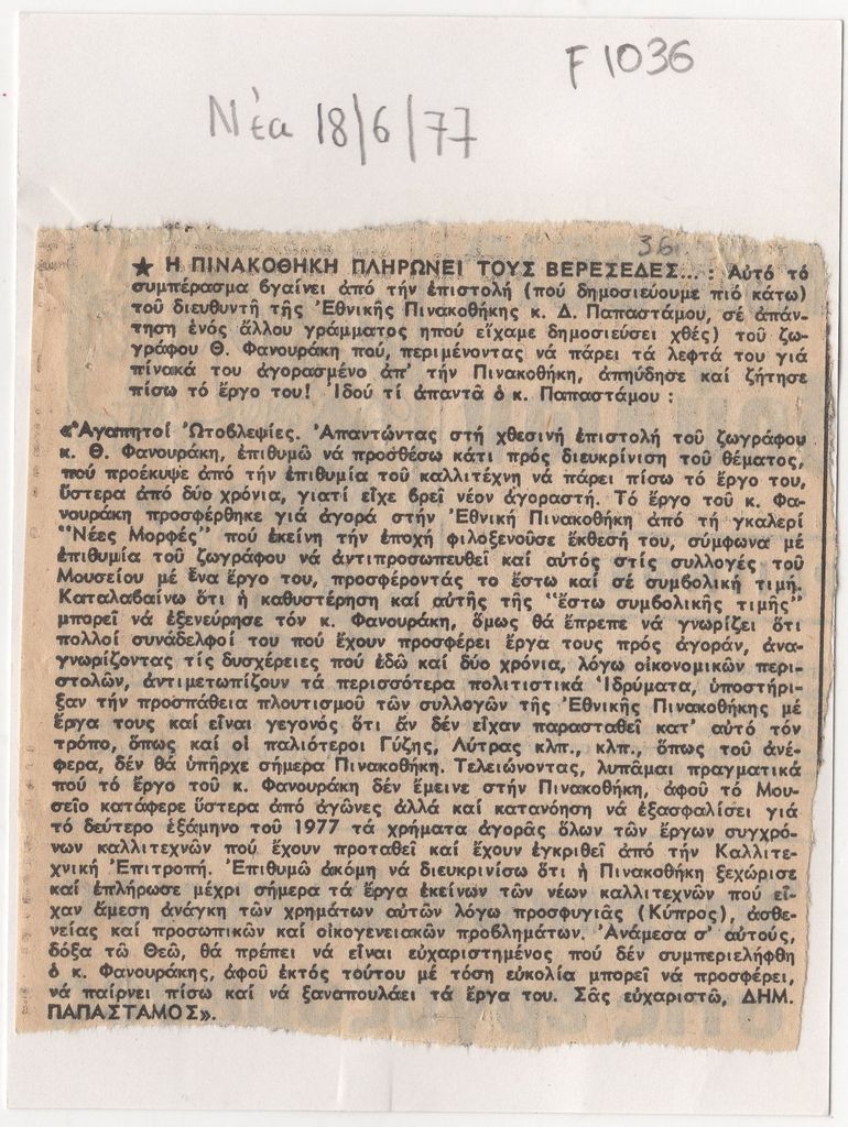 Απόκομμα, χαρτί συρραμμένο σε έντυπο, 14×10.5 εκ., στα ελληνικά, δημοσίευσης επιστολής του Δ. Παπαστάμου, διευθυντή της Εθνικής Πινακοθήκης, ως απάντηση σε προηγηθείσα επιστολή του Θωμά Φανουράκη στο έντυπο με την οποία εξεφραζε τη δυσαρέσκειά του για την καθυστέρηση πληρωμής του για έργο του που δώρησε στην Πινακοθήκη.