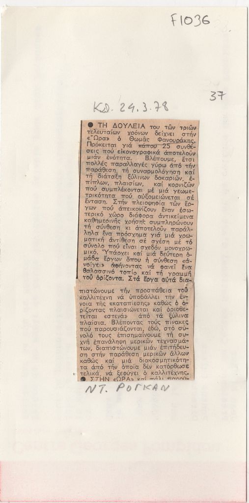 Απόκομμα, χαρτί, 21×10.5 εκ., στα ελληνικά, δημοσίευσης κριτικής έκθεσης του Θωμά Φανουράκη, η οποία διεξάγεται στο Καλλιτεχνικό Πνευματικό Κέντρο Ώρα στην Αθήνα.