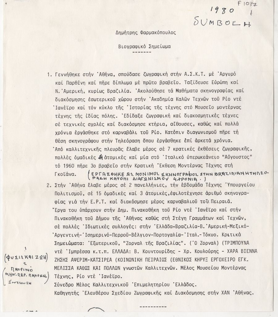Απόκομμα εντύπου της γκαλερί Συμβολή, χαρτί, 24,5×21 εκ., στα ελληνικά,. Περιέχει βιογραφικό σημείωμα του Δημήτρη Φαρμακόπουλου, στο οποίο αναγράφονται προσωπικές πληροφορίες, μετακινήσεις, διδασκαλία, εκθέσεις.