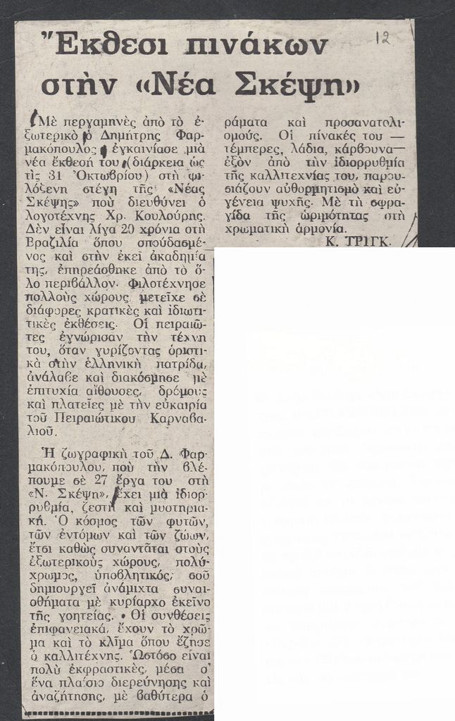Φωτοαντίγραφο αποκόμματος, κολλημένο σε χαρτόνι, 20×30 εκ., στα ελληνικά, δημοσίευσης κριτικής έκθεσης του Δημήτρη Φαρμακόπουλου στην αίθουσα Νέα Σκέψη στην Αθήνα.