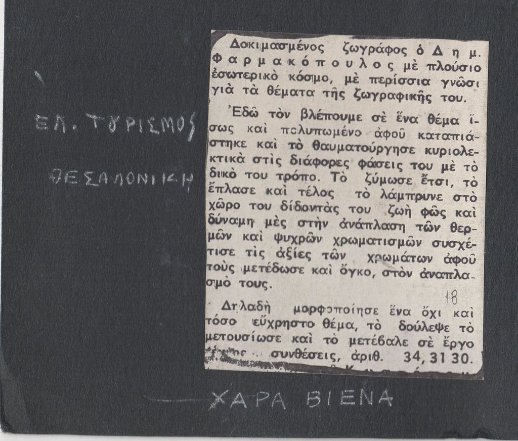 Φωτοαντίγραφο αποκόμματος, κολλημένο σε χαρτόνι, 20×30 εκ., στα ελληνικά, δημοσίευσης κριτικής έργου του Δημήτρη Φαρμακόπουλου.