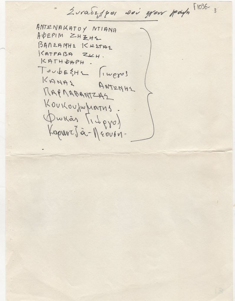 Χειρόγραφη λίστα, με μαύρο μελάνι, χαρτί, 28×21 εκ., στα ελληνικά, καλλιτεχνών που έγραψαν κριτικές για τον Δημήτρη Φαρμακόπουλο.