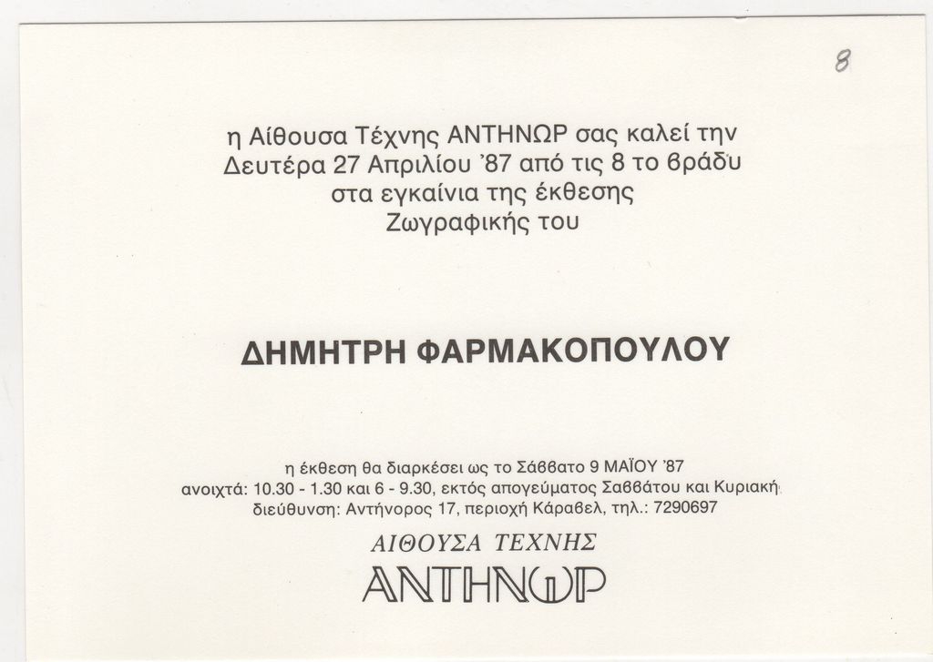 Πρόσκληση, χαρτόνι, 12×16.5 εκ., στα ελληνικά, εγκαινίων έκθεσης του Δημήτρη Φαρμακόπουλου.