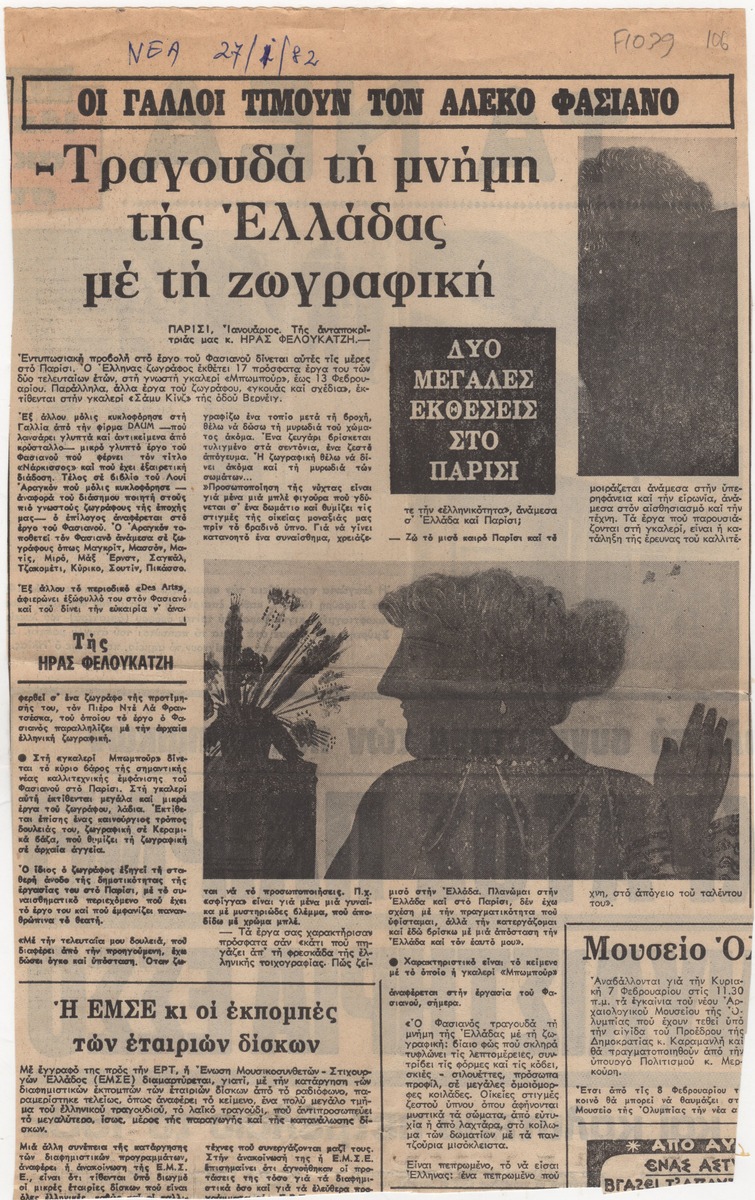 Απόκομμα της εφημερίδας “Τα Νέα” (27/01/1982), όπου δημοσιεύεται κριτική εκθέσεων του Αλέκου Φασιανού, στο Παρίσι. Δίνονται αποσπάσματα δηλώσεών του.