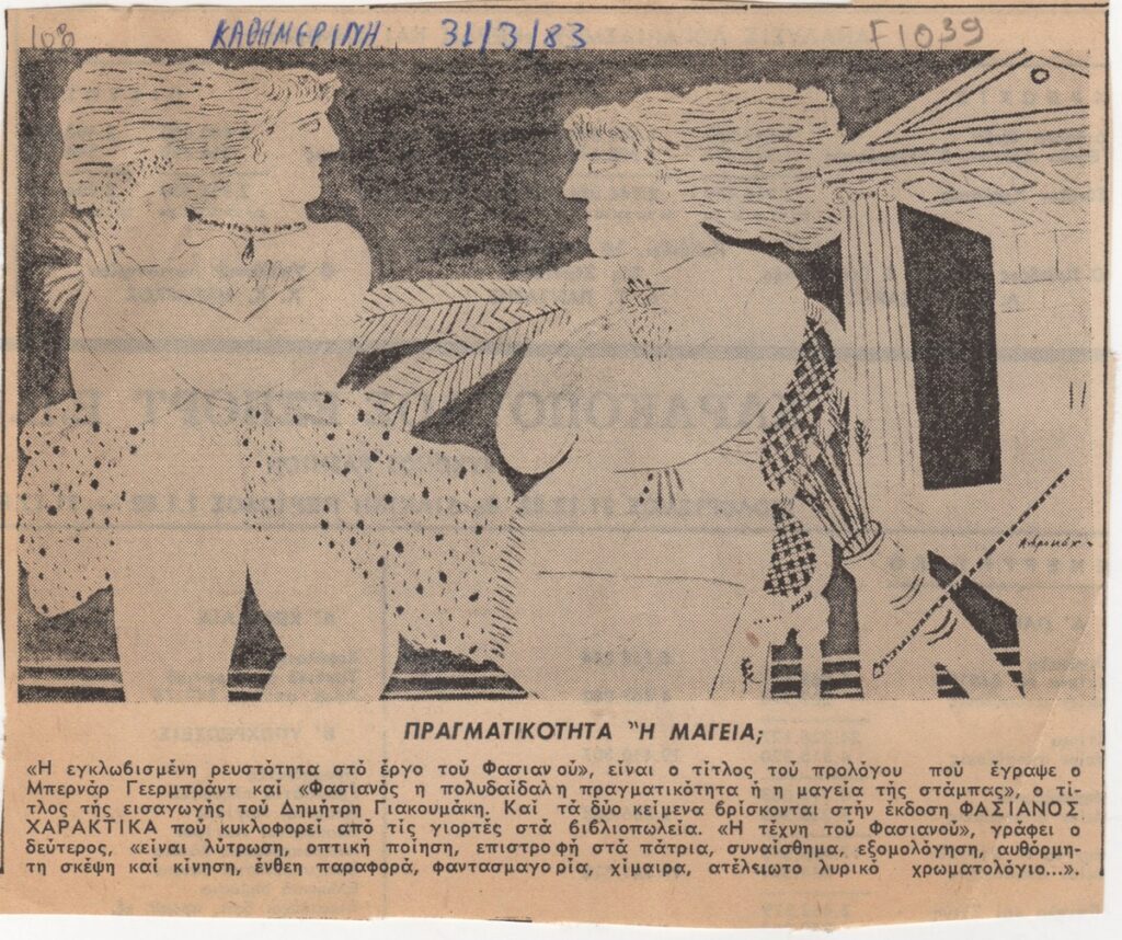 Απόκομμα της εφημερίδας “Η Καθημερινή” (31/03/1983), όπου δημοσιεύεται άρθρο με θέμα την έκδοση χαρακτικών του Αλέκου Φασιανού.