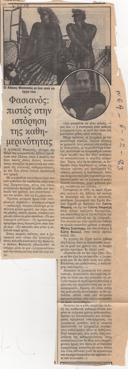 Απόκομμα της εφημερίδας “Τα Νέα” (03/12/1983), όπου δημοσιεύεται άρθρο με θέμα το εικαστικό έργο του Αλέκου Φασιανού, με αφορμή έκθεση του καλλιτέχνη στην γκαλερί Ζουμπουλάκη στην Αθήνα. Δίνονται βιογραφικές πληροφορίες για τον καλλιτέχνη.