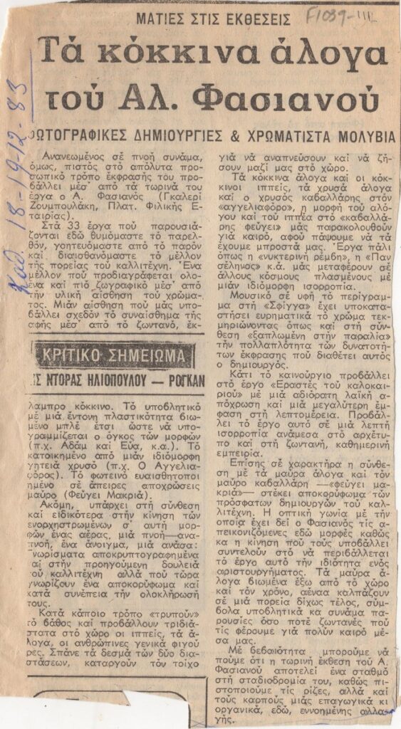 Απόκομμα της εφημερίδας “Τα Νέα” (18/12/1985) του Αλέκου Φασιανού, στην γκαλερί Ζουμπουλάκη, στην Αθήνα.