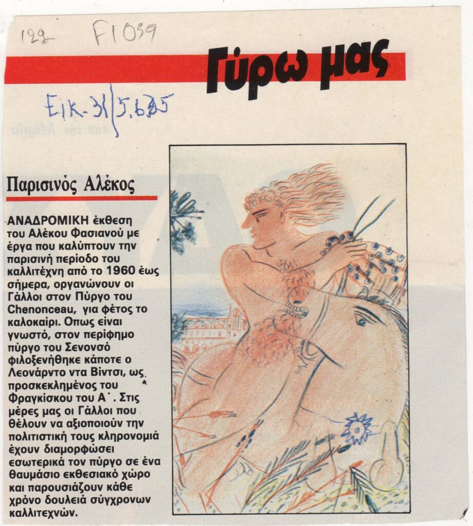 Απόκομμα του περιοδικού “Εικόνες”, τεύχος 31, (05/06/1985), αναφερόμενου σε αναδρομική έκθεση του Αλέκου Φασιανού στον πύργο του Chenonceau στη Γαλλία.
