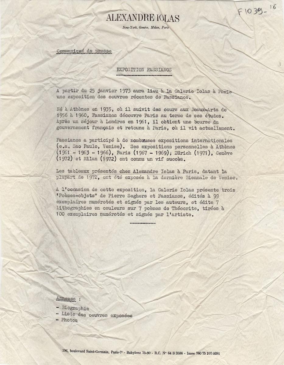 Φωτοαντίγραφο δελτίου τύπου έκθεσης του Αλέκου Φασιανού στην Galerie Alexandre Iolas στο Παρίσι. Δίνονται βιογραφικές πληροφορίες για τον καλλιτέχνη και πληροφορίες για την έκθεση. Σημειώνεται η κυκλοφορία εντύπου των Pierre Seghers και Φασιανού, με αφορμή την έκθεση.