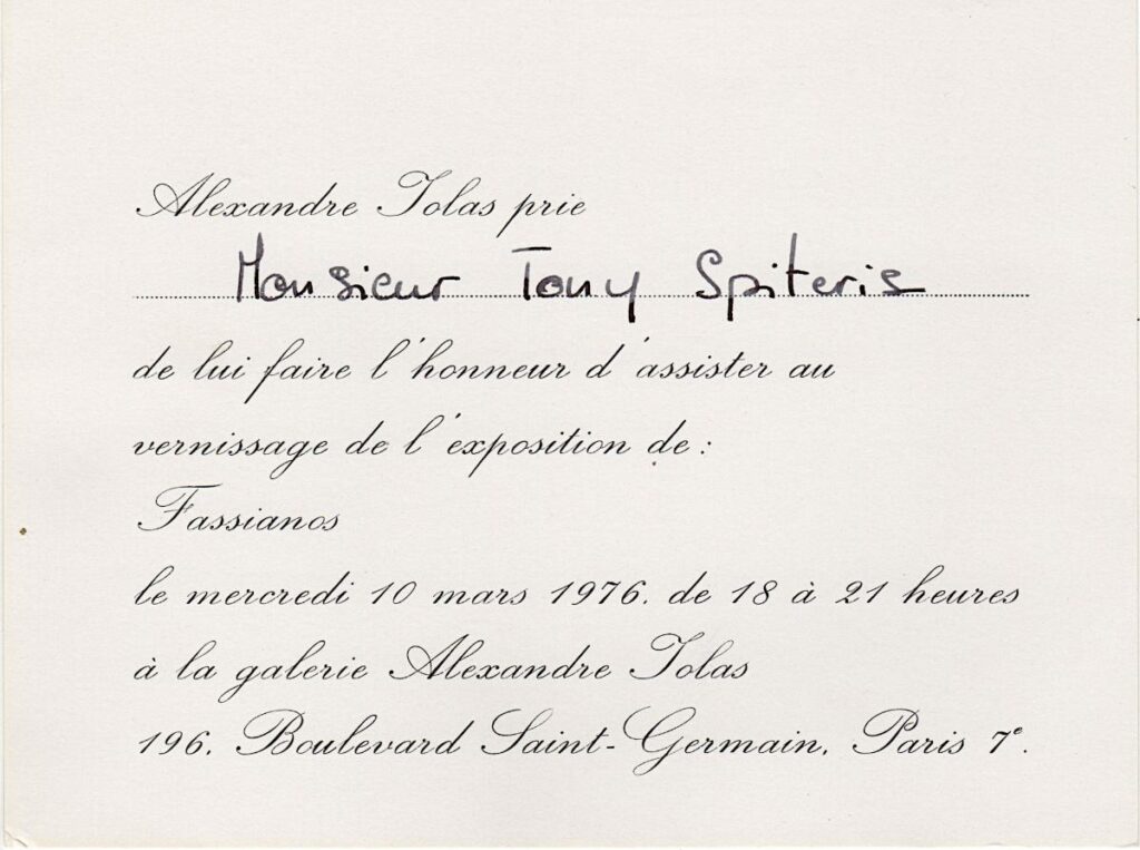 Πρόσκληση εγκαινίων έκθεσης του Αλέκου Φασιανού στην Galerie Alexandre Iolas στο Παρίσι, απεσταλμένη στον Τώνη Σπητέρη.