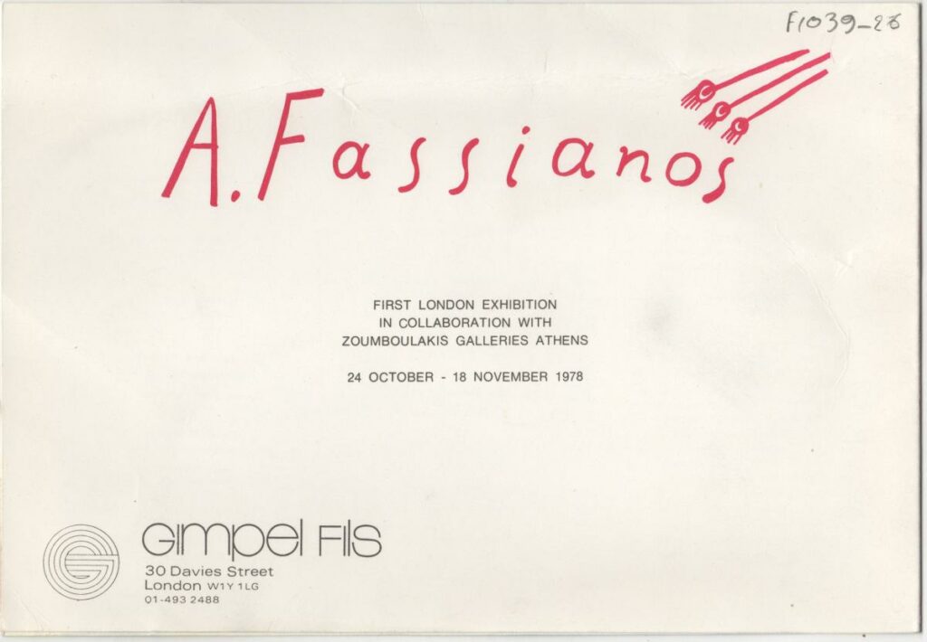 Έντυπο έκθεσης του Αλέκου Φασιανού στην Galerie Gimpel Fils στο Λονδίνο. Περιέχει βιογραφικό σημείωμα με λίστα εκθέσεων του καλλιτέχνη, κατάλογο έργων.