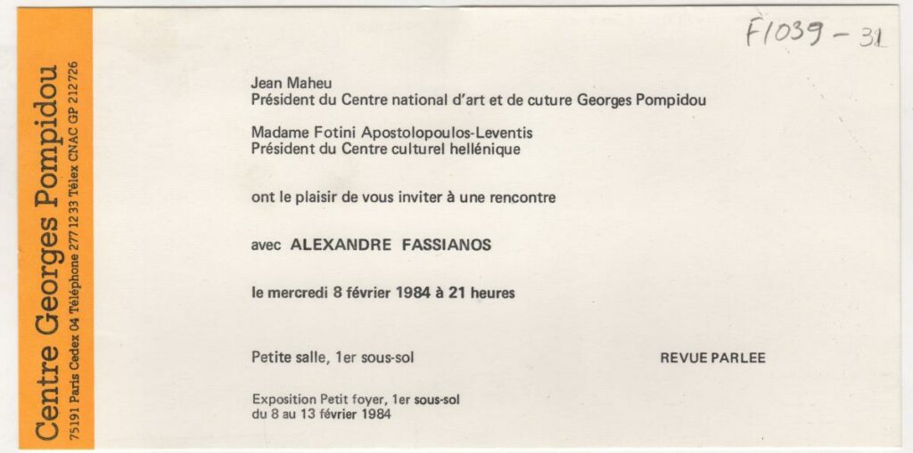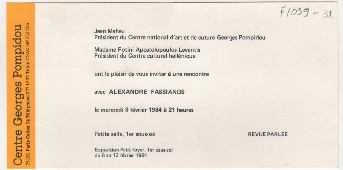 Πρόσκληση σε συνάντηση με τον Αλέκο Φασιανό στο πλαίσιο έκθεσής του στο Παρίσι στο Centre Georges-Pompidou στο Παρίσι.