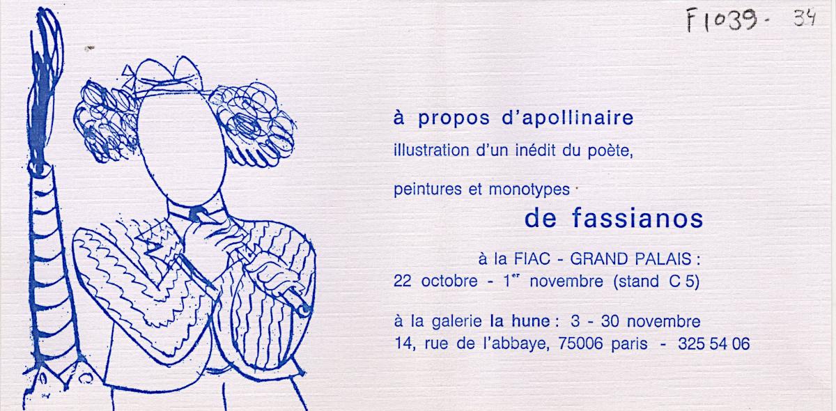 Πρόσκληση έκθεσης του Αλέκου Φασιανού, όπου παρουσιάζονται έργα από την εικονογράφηση ενός αδημοσίευτου έργου του Guillame Apollinaire.