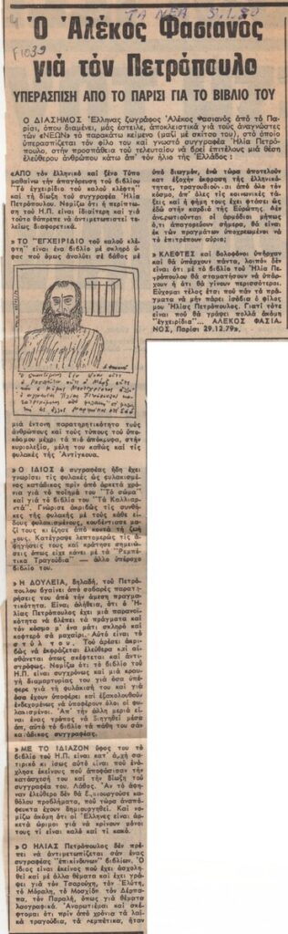 Απόκομμα της εφημερίδας “Τα Νέα” (05/01/1980), όπου δημοσιεύεται άρθρο του του Αλέκου Φασιανού στο οποίο υπερασπίζεται τον Ηλία Πετρόπουλο, συγγραφέα, ο οποίος δραστηριοποιείται στο Παρίσι.