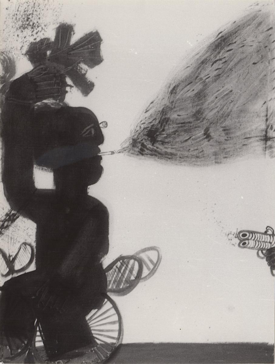 Ασπρόμαυρη εκτυπωμένη φωτογραφία έργου του Αλέκου Φασιανού. Στην πίσω όψη, επιγραφή.