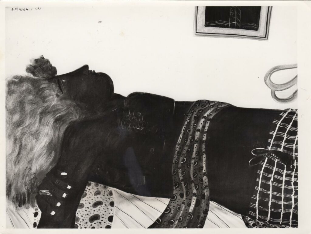 Ασπρόμαυρη εκτυπωμένη φωτογραφία έργου του Αλέκου Φασιανού. Στην πίσω όψη, κολλημένο έντυπο της γκαλερί Ιόλα του Μιλάνου, με πληροφορίες για το έργο.