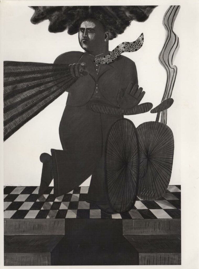 Ασπρόμαυρη εκτυπωμένη φωτογραφία έργου του Αλέκου Φασιανού. Στην πίσω όψη, κολλημένο έντυπο της Γκαλερί Ιόλα του Μιλάνου, με πληροφορίες για το έργο.