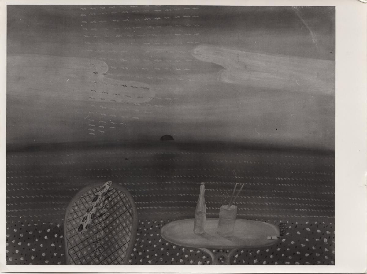 Ασπρόμαυρη εκτυπωμένη φωτογραφία έργου του Αλέκου Φασιανού. Στην πίσω όψη, κολλημένο έντυπο της Γκαλερί Ιόλα του Μιλάνου, με πληροφορίες για το έργο.