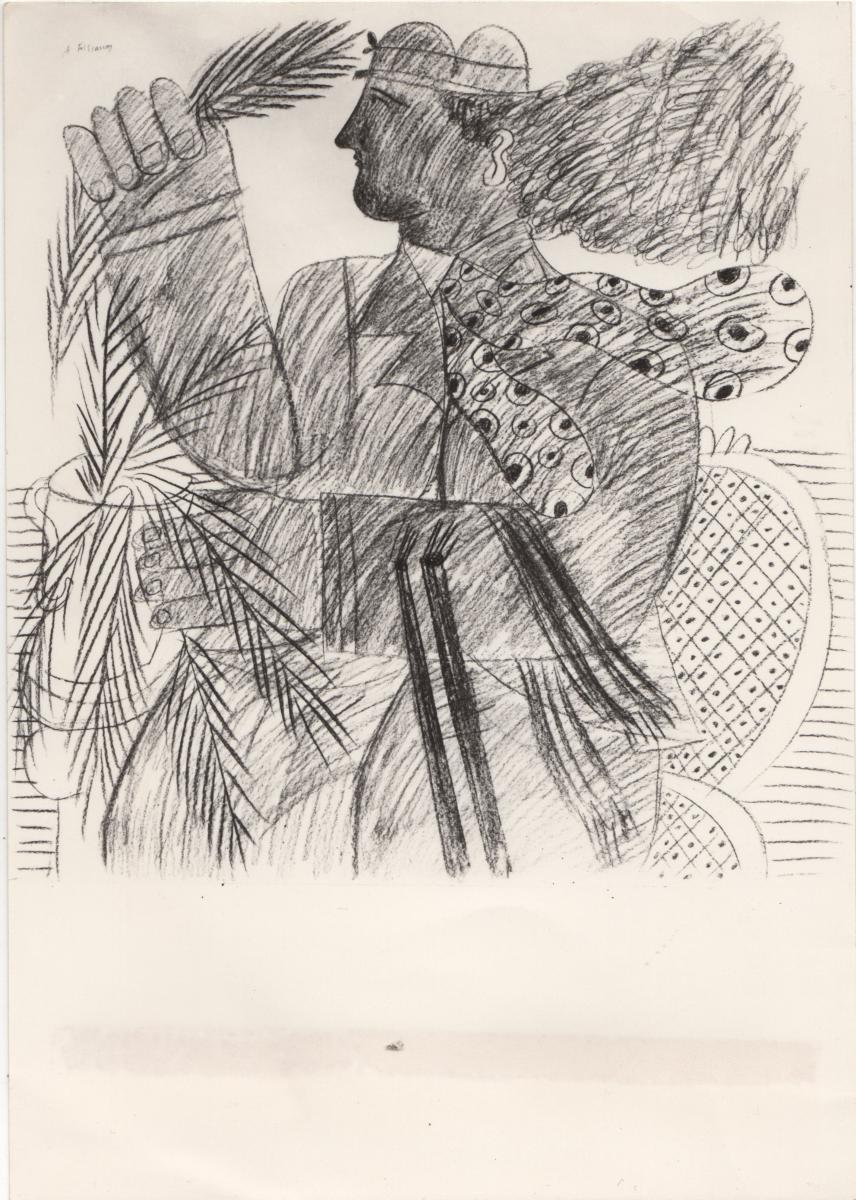 Ασπρόμαυρη εκτυπωμένη φωτογραφία έργου του Αλέκου Φασιανού. Στην πίσω όψη, επιγραφή.