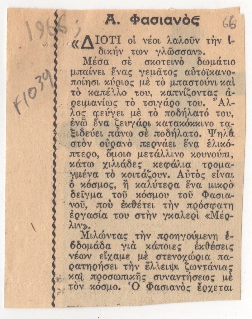 Απόκομμα εφημερίδας (1966;), όπου δημοσιεύεται κριτική έκθεσης του Αλέκου Φασιανού (πιθανόν στην γκαλερί Ζυγός).