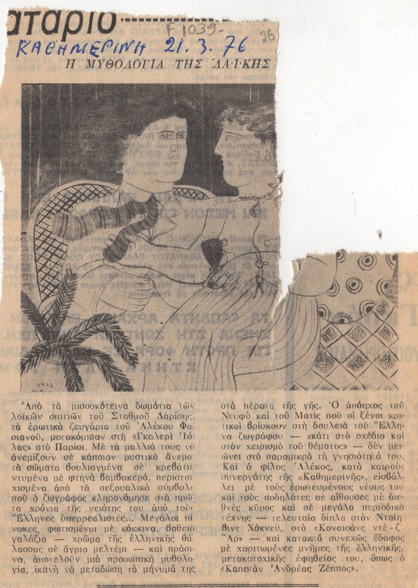 Απόκομμα της εφημερίδας “Η Καθημερινή” (21/03/1976), όπου δημοσιεύεται κριτική έκθεσης του Αλέκου Φασιανού, η οποία διεξάγεται στην γκαλερί Αλέξανδρου Ιόλα στο Παρίσι.
