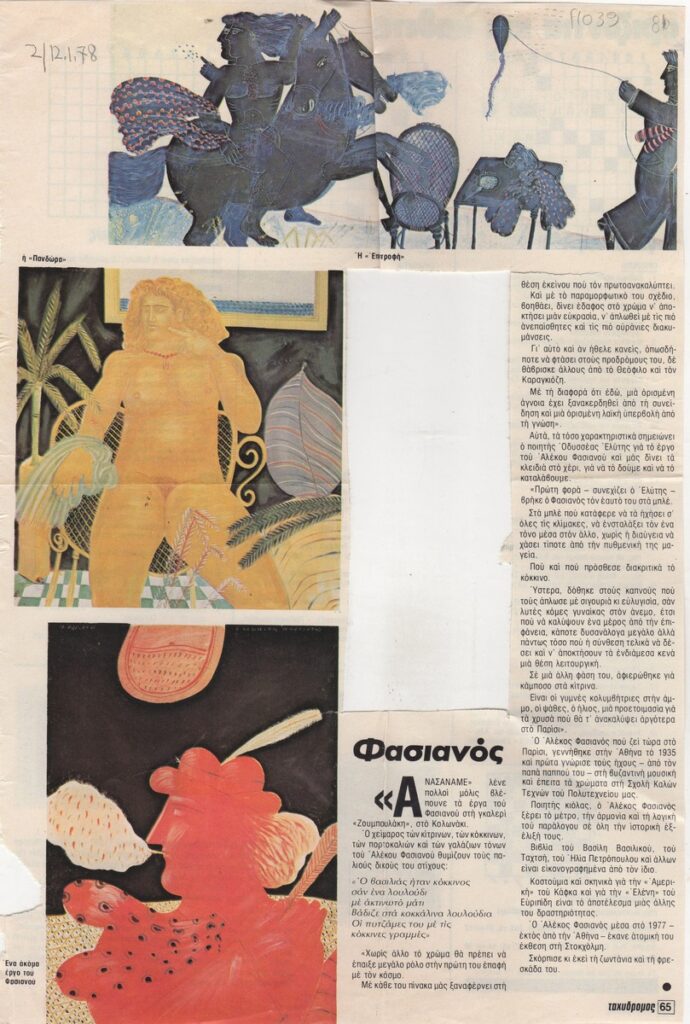 Απόκομμα του περιοδικού “Ο Ταχυδρόμος”, τεύχος 2 (12/01/1978), όπου δημοσιεύεται άρθρο με θέμα το εικαστικό έργο του Αλέκου Φασιανού.