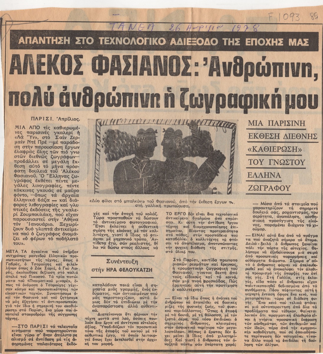 Απόκομμα της εφημερίδας “Τα Νέα”, (26/04/1978), όπου δημοσιεύεται συνέντευξη του Αλέκου Φασιανού, με αφορμή έκθεση του καλλιτέχνη στην γκαλερί La Hune στο Παρίσι.