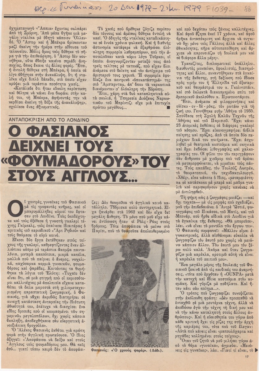 Απόκομμα του περιοδικού “Γυναίκα” (20/12/1978), όπου δημοσιεύεται άρθρο με θέμα την έκθεση του Αλέκου Φασιανού στο Λονδίνο. Δίνονται πληροφορίες για την προσωπική του ζωή, ενώ σχολιάζεται το εικαστικό του έργο.