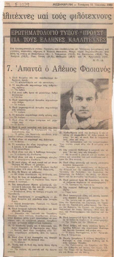 Απόκομμα της εφημερίδας “Μεσημβρινή” (11/06/1980), όπου δημοσιεύεται ερωτηματολόγιο που απευθύνεται σε Έλληνες καλλιτέχνες. Στο παρόν απαντά ο Αλέκος Φασιανός.