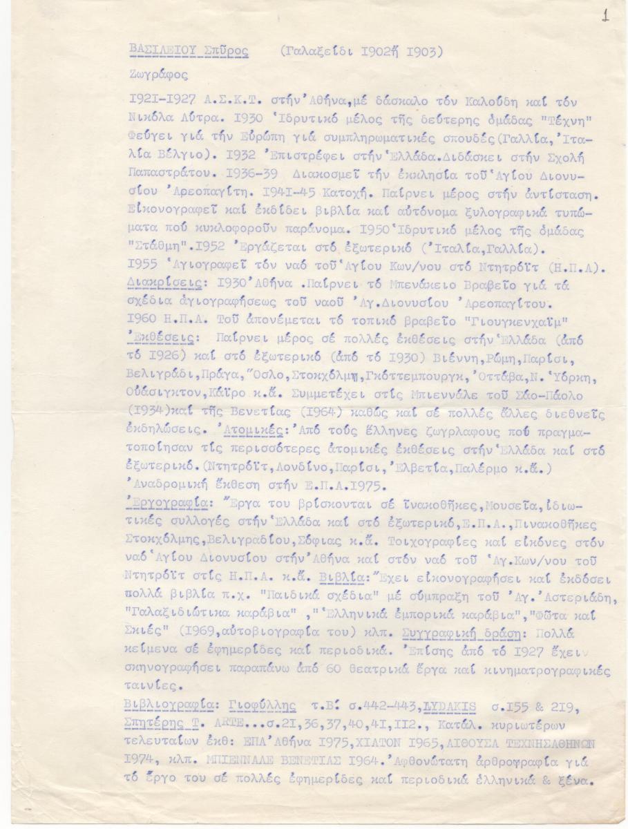 Κείμενο, δακτυλόγραφο, χαρτί, μία όψη, 28,2×21,5 εκ., στα ελληνικά. Βιογραφικά στοιχεία του Σπύρου Βασιλείου. Περιλαμβάνει διακρίσεις, εκθέσεις, εργογραφία και βιβλιογραφία. Χρονολογείται πριν το 1985 καθώς δεν αναφέρει έτος θανάτου.