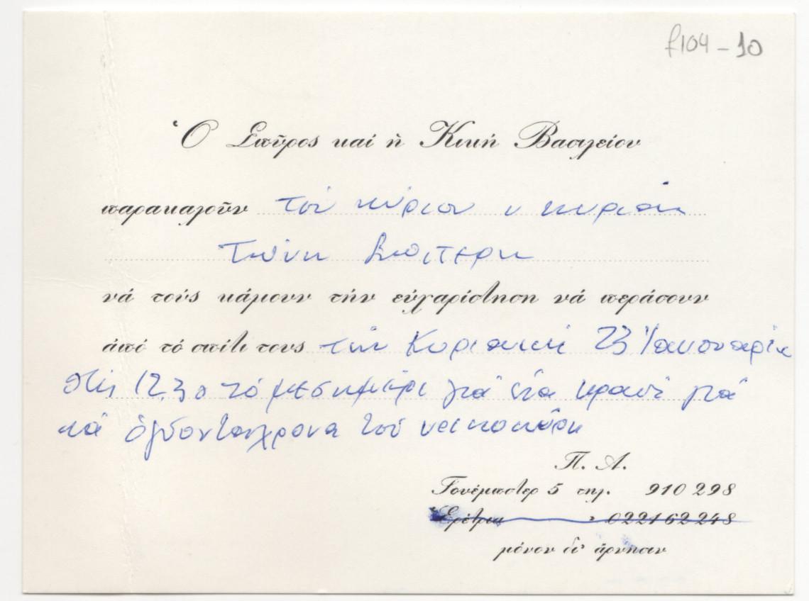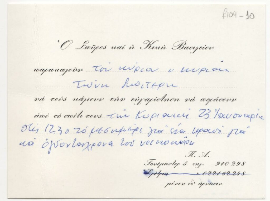 Έντυπο, στα ελληνικά, μονόφυλλο, χαρτόνι, μία όψη, 10,5×14,0 εκ. Πρόσκληση σε γεύμα για τον εορτασμό των ογδοηκοστών γενεθλίων του Σπ. Βασιλείου προς το ζεύγος Σπητέρη.