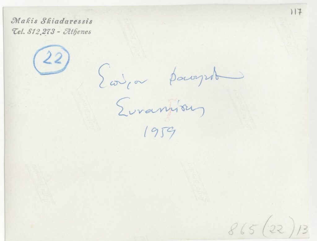 Φωτογραφία έργου, α/μ, σε φωτογραφικό χαρτί, 12,2×15,6 εκ. Στην πίσω όψη σφραγίδα του Μ. Σκιαδαρέση και επιγραφές.