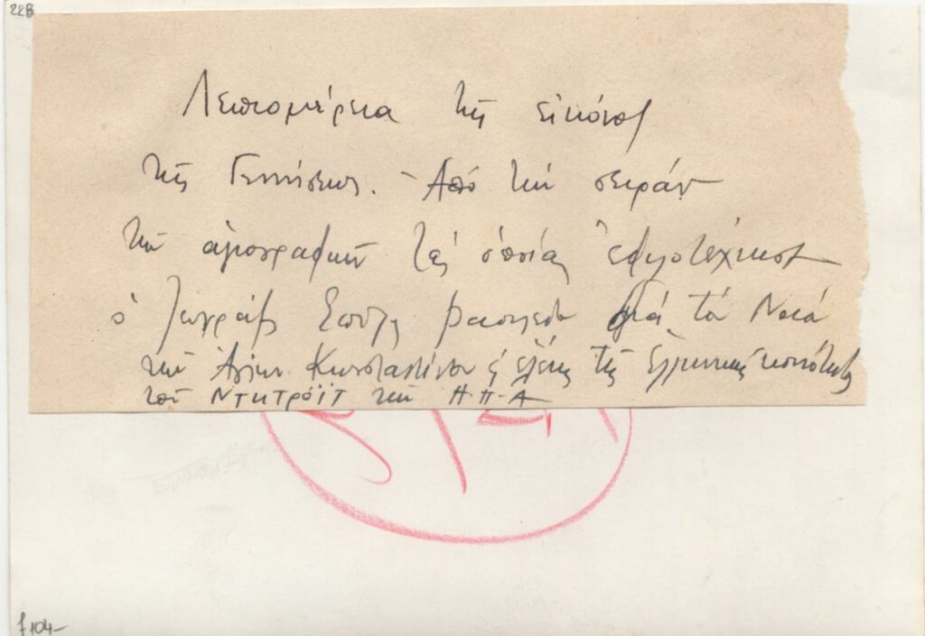 Φωτογραφία έργου, α/μ, σε φωτογραφικό χαρτί, 18,0×12,8 εκ. Στην πίσω όψη κολλημένο απόκομμα χαρτιού με επιγραφή.