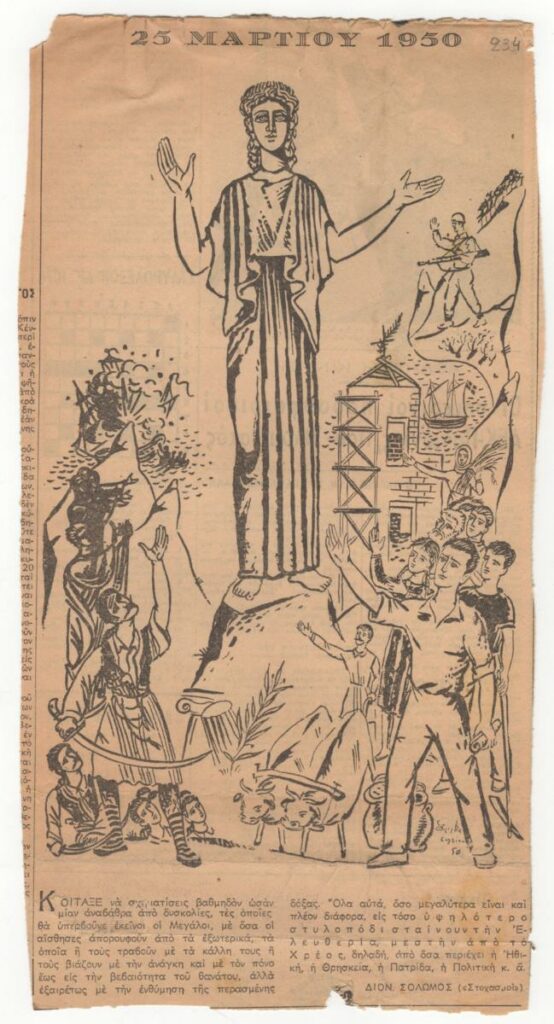 Απόκομμα, έντυπο, χαρτί, 29,4×15,3 εκ., όπου δημοσιεύεται, αναπαραγωγή χαρακτικού του Σπ. Βασιλείου με θέμα την επέτειο της ελληνικής επανάστασης. Εικονογραφεί απόσπασμα κειμένου από το έργο “Στοχασμοί” του Διονυσίου Σολωμού. Στην πίσω σελίδα αθλητική επικαιρότητα και αναγγελία της παράστασης της Εθνικής Λυρικής Σκηνής με το έργο του Oscar Strauss “Ονειρώδες Βαλς”.