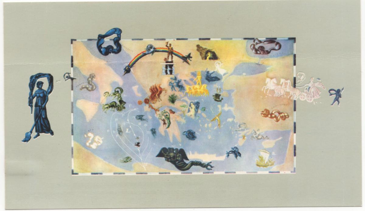 Ευχετήρια κάρτα απεσταλμένη από το ζεύγος Βασίλη και Πέρης Κυριαζοπούλου. Στη μία όψη, αναπαραγωγή έργου του Σπύρου Βασιλείου, η τοιχογραφία που δημιούργησε στο Μετεωροσκοπείο του Αριστοτελείου Πανεπιστημίου Θεσσαλονίκης το 1955.