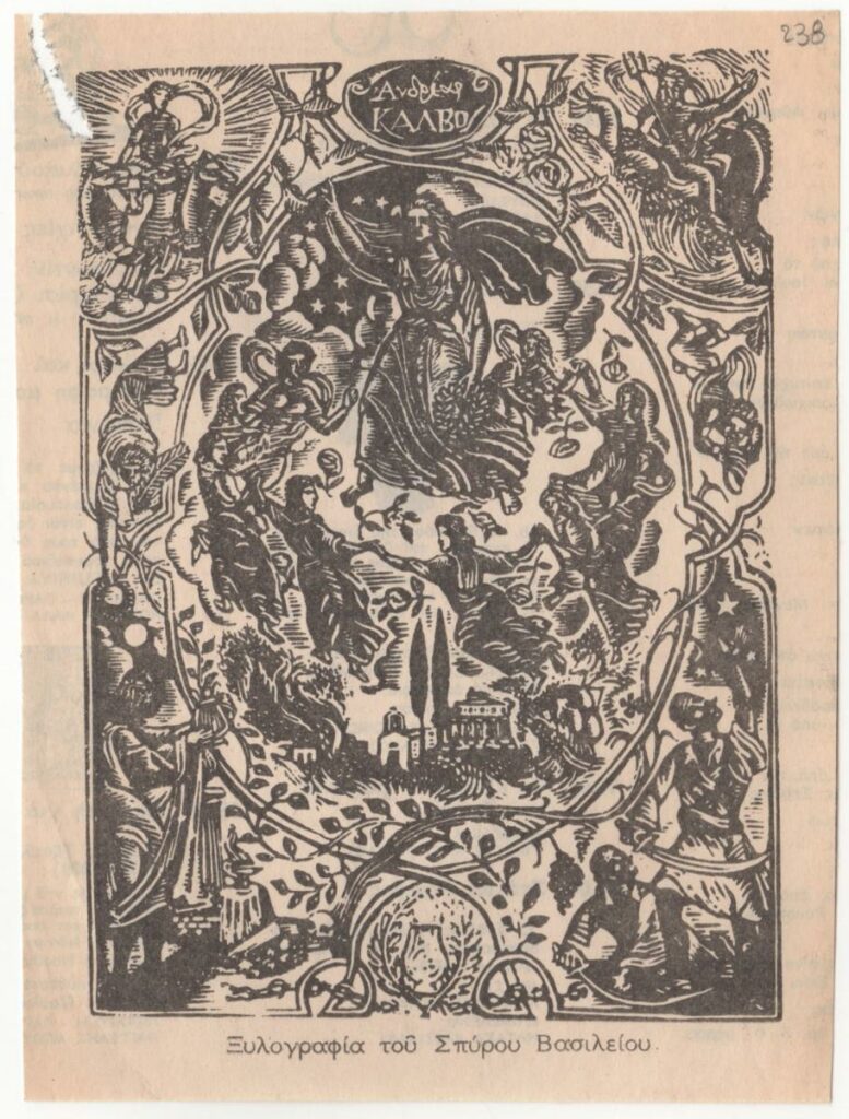 Ξυλογραφία του καλλιτέχνη με θέμα την ποίηση του Ανδρέα Κάλβου σε άγνωστο έντυπο (εφημερίδα ή περιοδικό).