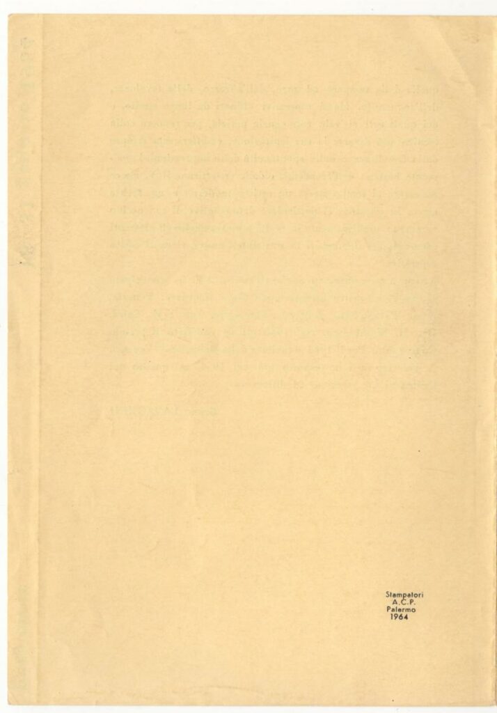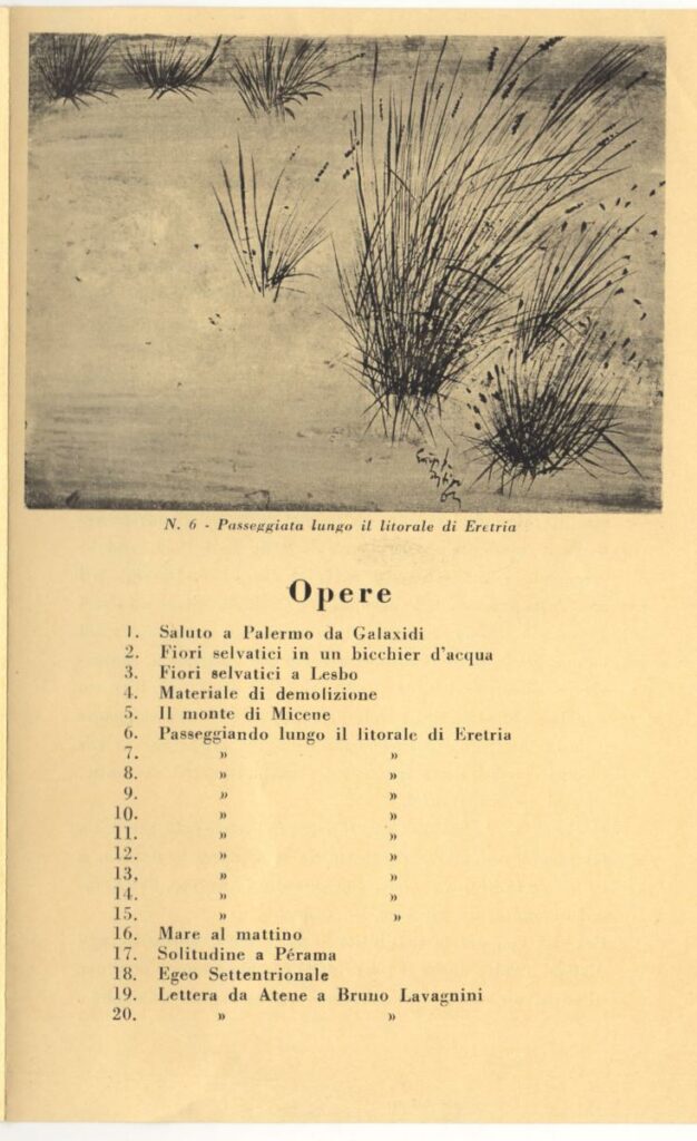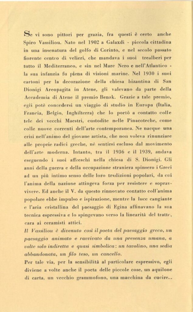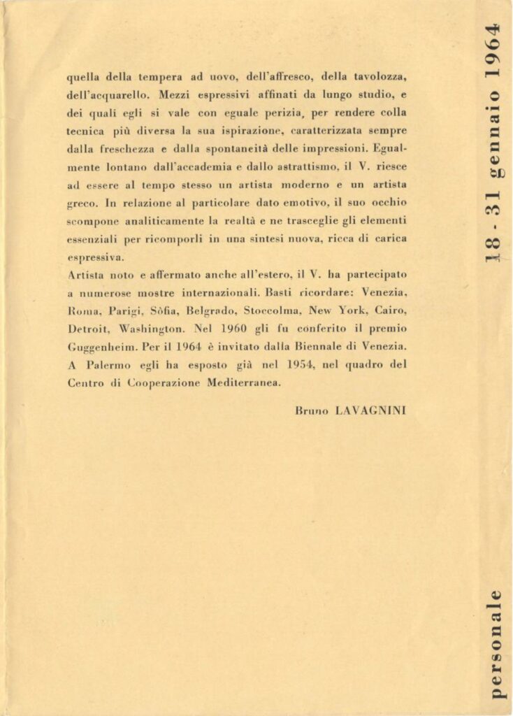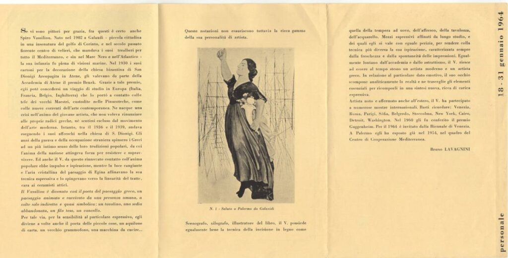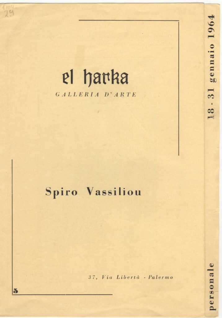 Έντυπο έκθεσης του Σπύρου Βασιλείου στην El Harka Galleria d’Arte στο Παλέρμο. Περιέχει κείμενο του Bruno Lavagnini και κατάλογο των έργων της έκθεσης.